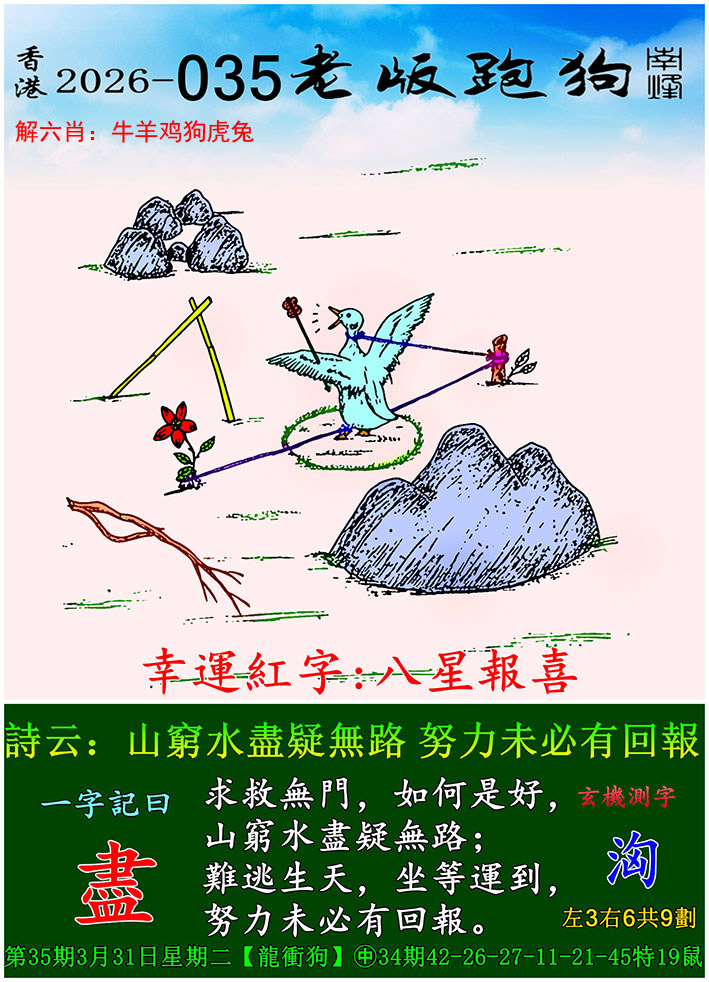 老版跑狗一字記之曰:【盡】 詩云:山窮水盡疑無路,努力未必有回報。求救無門,如何是好;山窮水盡疑無路;難逃生天,坐等運到,努力未必有回報。玄機測字:《洶》